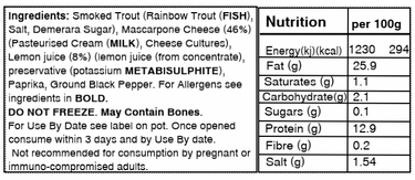 Ingredients: Smoked Trout (Rainbow trout (FISH), Salt, Demerara Sugar), Mascarpone Cheese (Pasteurised Cream (MILK), Cheese cultures, Lemon Juice (from concentrate), preservative (Potassium METABISULPHITE), Paprika, Ground Black Pepper.