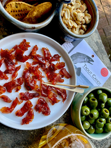 Our high-welfare rainbow trout fillets are cut into thin strips and cured in-house using a sweet cure of maple syrup, honey, dark muscavado sugar and salts. We then add a generous dusting of Aleppo Chilli Flakes, before gently hot smoking over apple and alder wood chips, creating a fantastic alternative snack to be enjoyed either with drinks as an aperitif, or sprinkled over salads / pizzas / breads.