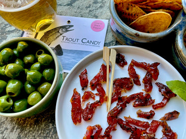 Our high-welfare rainbow trout fillets are cut into thin strips and cured in-house using a sweet cure of maple syrup, honey, dark muscavado sugar and salts. We then add a generous grind of Coarse Black Pepper before gently hot smoke over apple and alder wood chips creating a fantastic alternative snack to be enjoyed either with drinks as an aperitif, or sprinkled over salads / pizzas / breads.