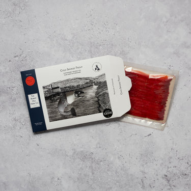 Our beetroot-cure recipe cold smoked trout. An initial submersion in organic beetroot juice then dry-cured ourselves by hand using our own unique blend of salt and Demerara sugar. Slowly cold smoked for 12 hours in our own smokehouse over beech and Alder before being sliced by hand. Our fish are raised in crystal clear pure rainwater using our sustainable raising methods, which produces a delicate and unique flavour profile, perfectly balanced with our secret beetroot cure mix blend to create a really luxurious product. Perfect for topping blinis spread with cream cheese and topped with our fresh herbs. 100g.