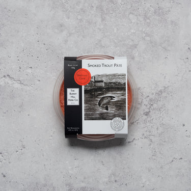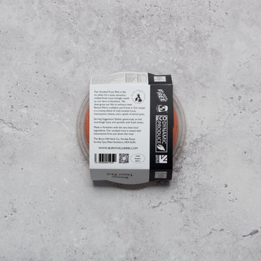 Our traditional-cure recipe cold smoked trout pâté. Our trout is dry-cured ourselves by hand using our own unique blend of salt and Demerara sugar. Slowly cold smoked for 8 hours in our own smokehouse over beechwood and oak. Our smoked trout is then blended with "Yorkshire Cheese" Mascarpone and a handful of other natural ingredients.