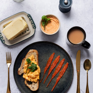 Our traditional-cure recipe cold smoked trout. Dry-cured ourselves by hand using our own unique blend of salt and Demerara sugar. Slowly cold smoked for 8 hours in our own smokehouse over beechwood and oak before being sliced by hand. Our fish are raised in crystal clear pure rainwater using our sustainable raising methods, which produces a delicate and unique flavour profile, perfectly balanced with our secret blend curing mix to create a really luxurious product. Perfect for topping blinis spread with cream cheese and topped with our fresh herbs. 100g.