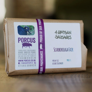 SCARBOROUGH FAIR - One of the oldest sausage recipes. Originally sold at the Scarborough Fair as far back as the 1700's. Fresh parsley, sage, rosemary and thyme makes for a scrumptious herby sausage that goes great in a casserole or with mash and onion gravy to keep your spirits up on the coldest of days! Minimum pack weight 360g. Four generously-sized artisan sausages.