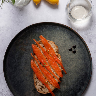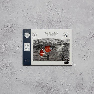 Our traditional cure recipe cold smoked trout. Two 100g pouches inside one TWIN PACK! Dry-cured ourselves by hand using our own unique blend of salt and Demerara sugar. Slowly cold smoked for 12 hours in our own smokehouse over beech and oak before being sliced by hand. Our fish are raised in crystal clear pure rainwater using our sustainable raising methods, which produces a delicate and unique flavour profile, perfectly balanced with our secret beetroot cure mix blend to create a really luxurious product. Perfect for topping blinis spread with cream cheese and topped with our fresh herbs.